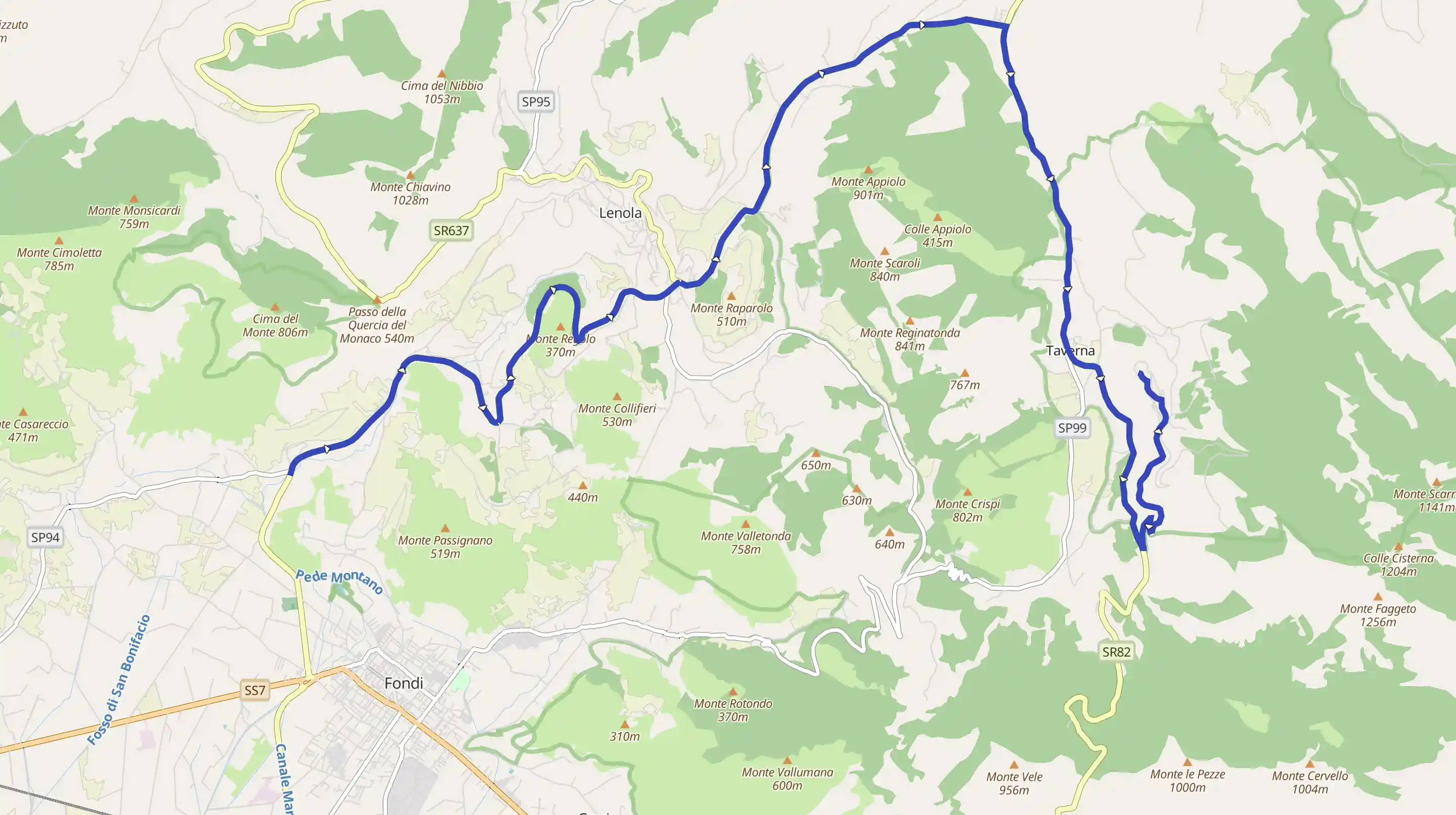 Partendo dal parcheggio del ristorante "Al Boschetto" si affronta la salita per Lenola e, dopo una serie di saliscendi su manto stradale a tratti rovinato, la salita per l'accesso al centro di Campodimele.